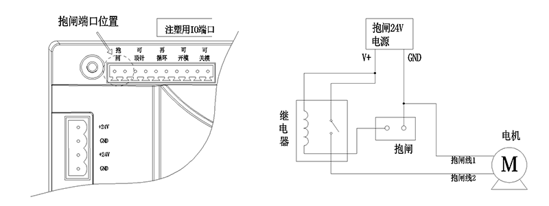 注:抱闸端口必须顺利获得外接继电器去控制抱闸器工作。
