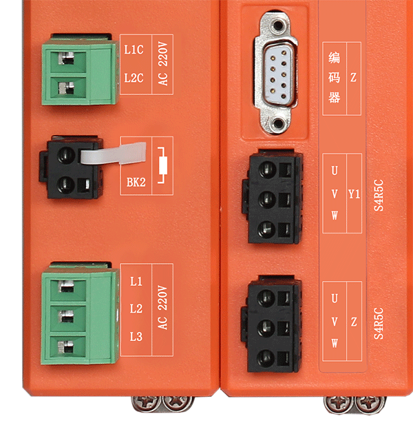 U | 伺服电机 接入端子1-2 | 连接三相 伺服电机 | 依照UVW对应接入,否则导致电机不转或飞车现象。 |