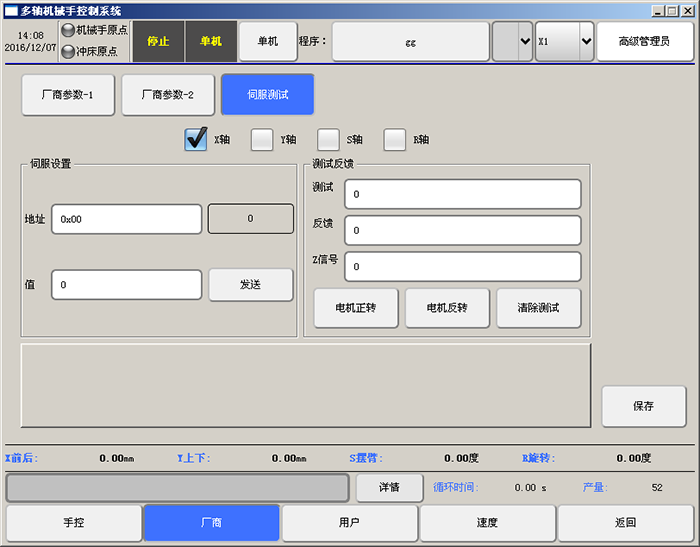 皇冠crown(中国)系列驱控一体冲压机械手控制系统,轴伺服调试操作方式。界面如下: