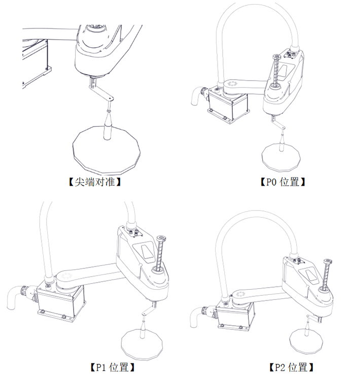 3)移动机械手到标定点正上方,机械手的尖端要与标定工具的尖端对准,设入P0;转到U轴获取新的角度,移动机械手使其尖端对准标定工具的尖端,设入P1;再次转到U轴获取新的角度,移动机械手使其尖端对准标定工具的尖端,设入P2;再次转到U轴获取新的角度,移动机械手使其尖端对准标定工具的尖端,设入P3;以此类推,改变U轴坐标,设置多个点。