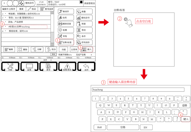 点击“注释/标签”按钮可进入注释/标签的教导页面,插入了注释后,可以对上一步程序或者下一步程序进行说明;同时在执行子程序跳转时必须先要插入“注释/标签”才可将条件插入进主程序中。(如果使用条件必须插入“注释/标签”)